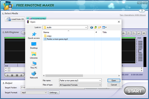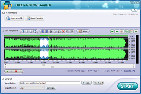 Launch Free Ringtone Maker. Click “Load from file” and a browser window pops up. Then, click “Open” to input the audio file to program. If you want to input tracks from your audio CD, you should insert an audio disc into the drive and click “Load from CD”. The added file will be displayed in waveform which is convenient for visual editing.