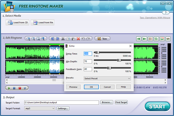 Click “Echo” to activate the setting window. Specify detailed parameters or apply some popular presets to adjust the effect. Click “Preview” to listen to the ringtone before adding the effects to the waveform to make sure you get exactly what you want. Then click “OK” to add echo effect to the selected region.