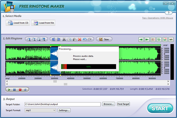 Click “Browser” to choose an output folder for the edited file. Select an output format from MP3, WMA, WAV and OGG in the “Target Format” drop-down list. Click “Settings” to use the well-configured presets or specify the configuration parameters to adjust the output quality for every format. Then, click “START” to output the ringtone. When the processing window disappears, click “Find Target” to find the file location. Now, you can transfer the DIY ringtone to your mobile phone.