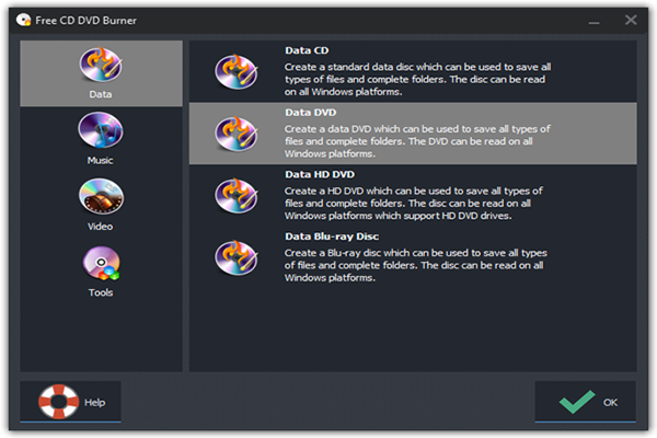 Insert a writable CD into your disc drive and launch Free CD DVD Burner. Click “Data DVD/CD” to activate the data DVD/CD burner wizard.