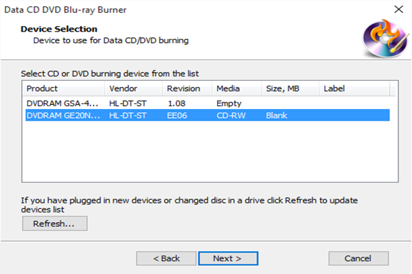 The burner scans your system and all the available drives are displayed in the list. Select the usable disc drive from the list (the system will select it by default if there is only one). If you plug in new devices or change the disc in the drive, click “Refresh” to update the device list.