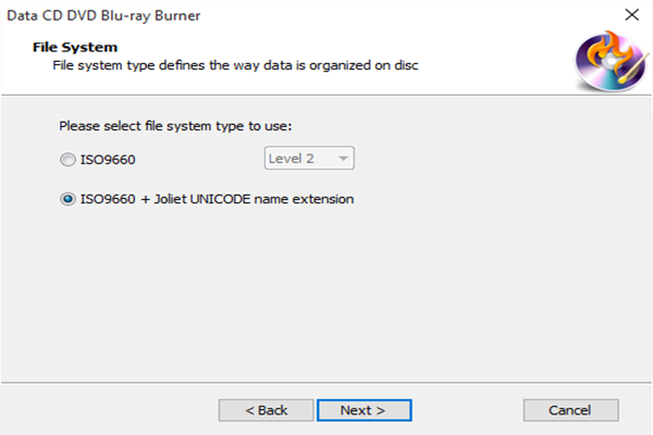 Choose a system type to use. We provide ISO-9660 level 1 & 2 and ISO-9660 + Joliet UNICODE name extension to choose. Then, you may choose to create bootable disc. Just check the “Create bootable disc” and click “Browser” to find and open the boot image files.