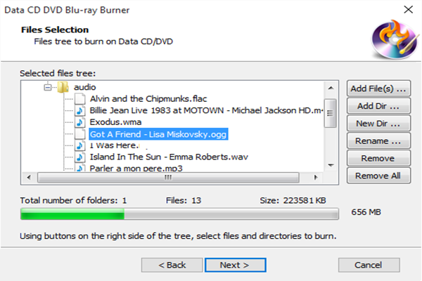 Click “Add File(s)…” & “Add Dir…” to add data files & folders you want to burn and use “New Dir…” or “Rename Dir…” to create or rename the folder. Click “Remove” or “Remove All” to delete one or all listed files. There are also information of file size and disc size.