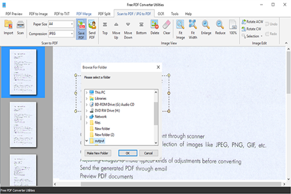 Select Page Size (A0-6, B5, Letter (8.5″ × 11″), Legal (8.5″ × 14″), ledger (17″ × 11″)) and Compression (RLE, G3Fax, G4Fax, JPEG). Click “Save PDF” to choose the output folder and then “OK” to convert these scanned image to PDF.