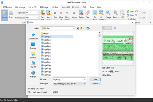 Launch Free PDF Converter Utilities and click “Scan to PDF/JPG to PDF“. Then click “Import” to choose an image file you want to convert. Press Ctrl or Shift key to select multiple image files. Click “Open” to input the images to the conversion window.