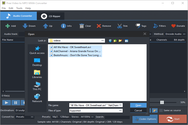 In the menu of “Settings Type”, select one conversion type from “Presets” and“Codec”. If “Presets” has been chosen, you will see a whole list of quality presets in the dropdown menu of “Presets“. Choose an audio format as you need. To adjust codec settings, click “Codec Options”. To specify effects and filter settings, click“Filters”. After that, click “Browse” to choose an output folder for the converted audio files or check “Same as source” to save them in the source folder.