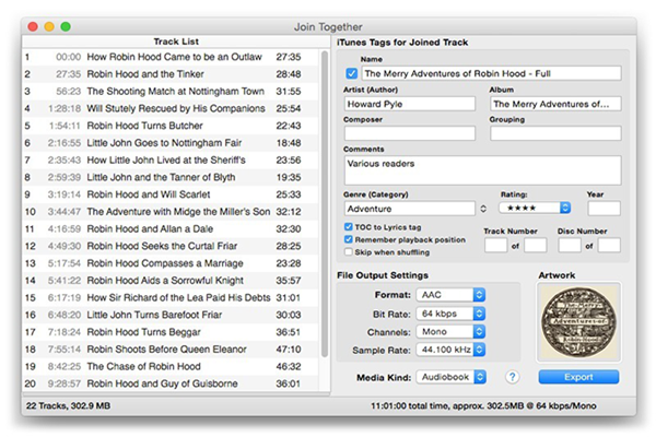 iTunesJoin is another audio joiner solution for Mac. It is an application/AppleScript package that works with iTunes to join multiple tracks into a single track.