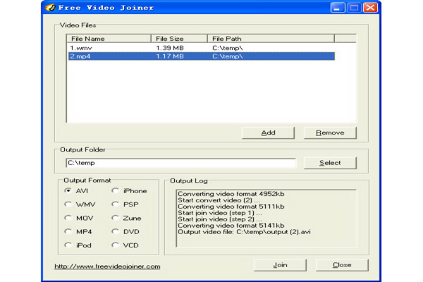 Free Video Joiner is a light-weight video joiner which can work on Windows. It can save you money, but it has some drawbacks. For example, it does not include much quality adjustment options, just some output formats and devices to choose.